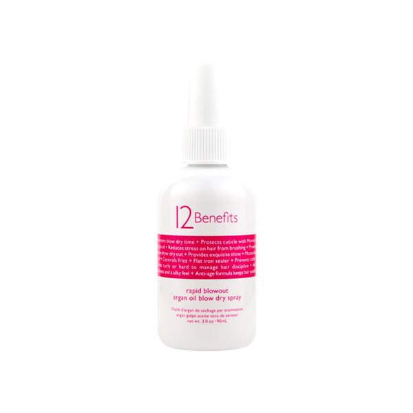 12 Benefits Rapid Blowout contains a zero weight formula that delivers an exquisite, shiny finish to hair creating the ultimate blowout. This beautifying argan spray is formulated with only three, naturally pure ingredients that work together to disperse water from the hair’s surface.
