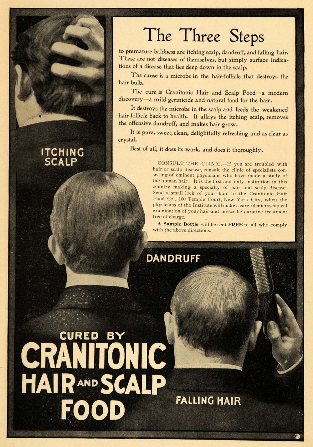 This is an original 1901 black and white print ad for the Cranitonic Hair Food Company, located at 100 Temple Court in New York City, featuring their three-step hair and scalp hair food treatment for itching, dandruff, and hair loss.