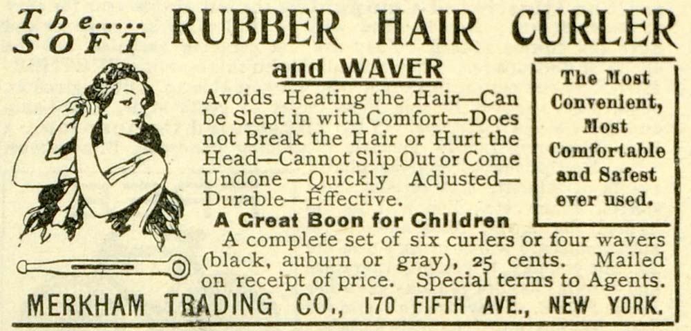 This is a tiny original 1901 black and white print ad for the Rubber Hair Curler and Waver, a product line by the Merkham Trading Company, located at 170 Fifth Avenue in New York.