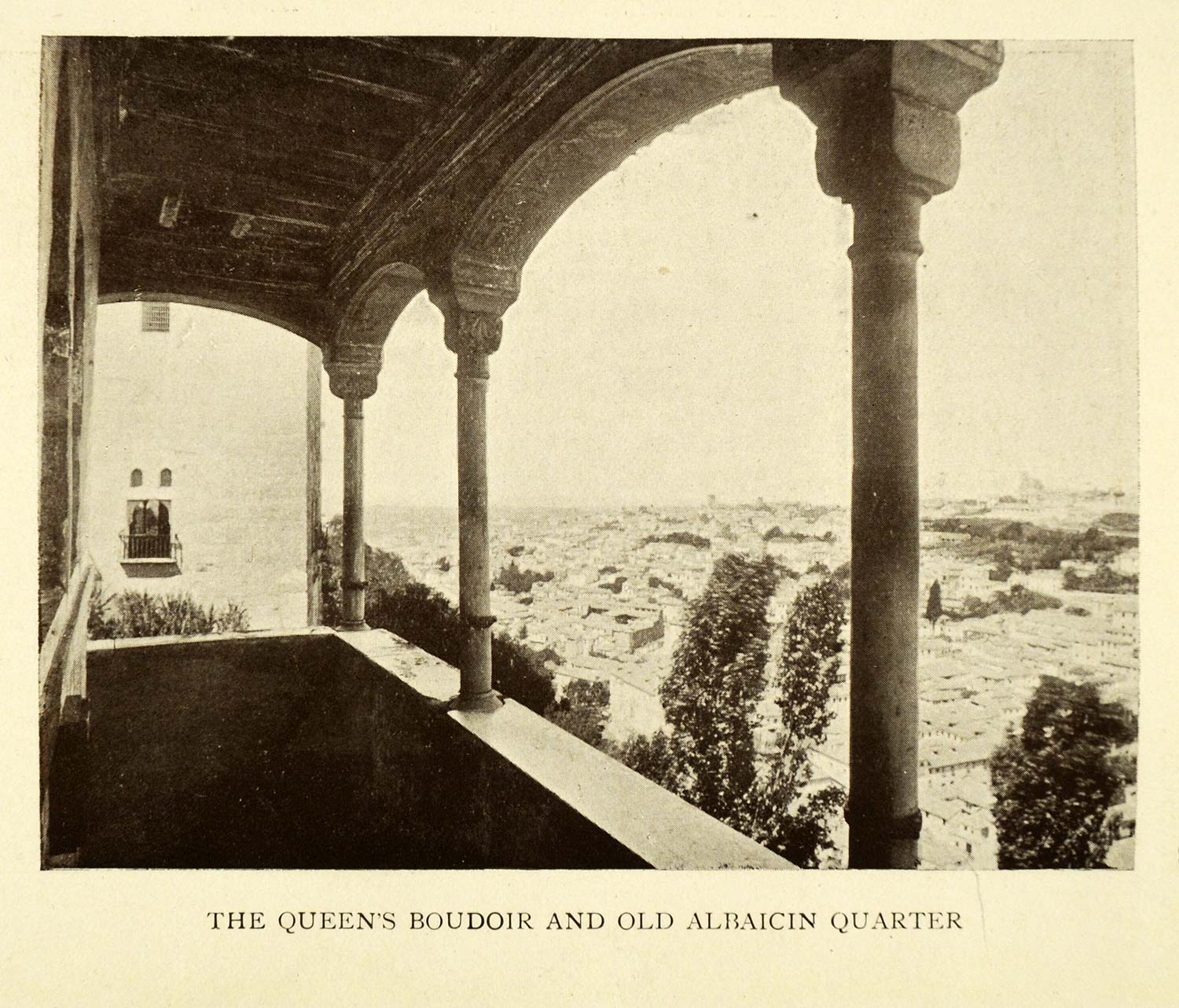 This is an original 1907 sepia halftone print of The Queen’s Boudoir and Old Albaicin Quarter in the Alhambra in Granada, Spain.