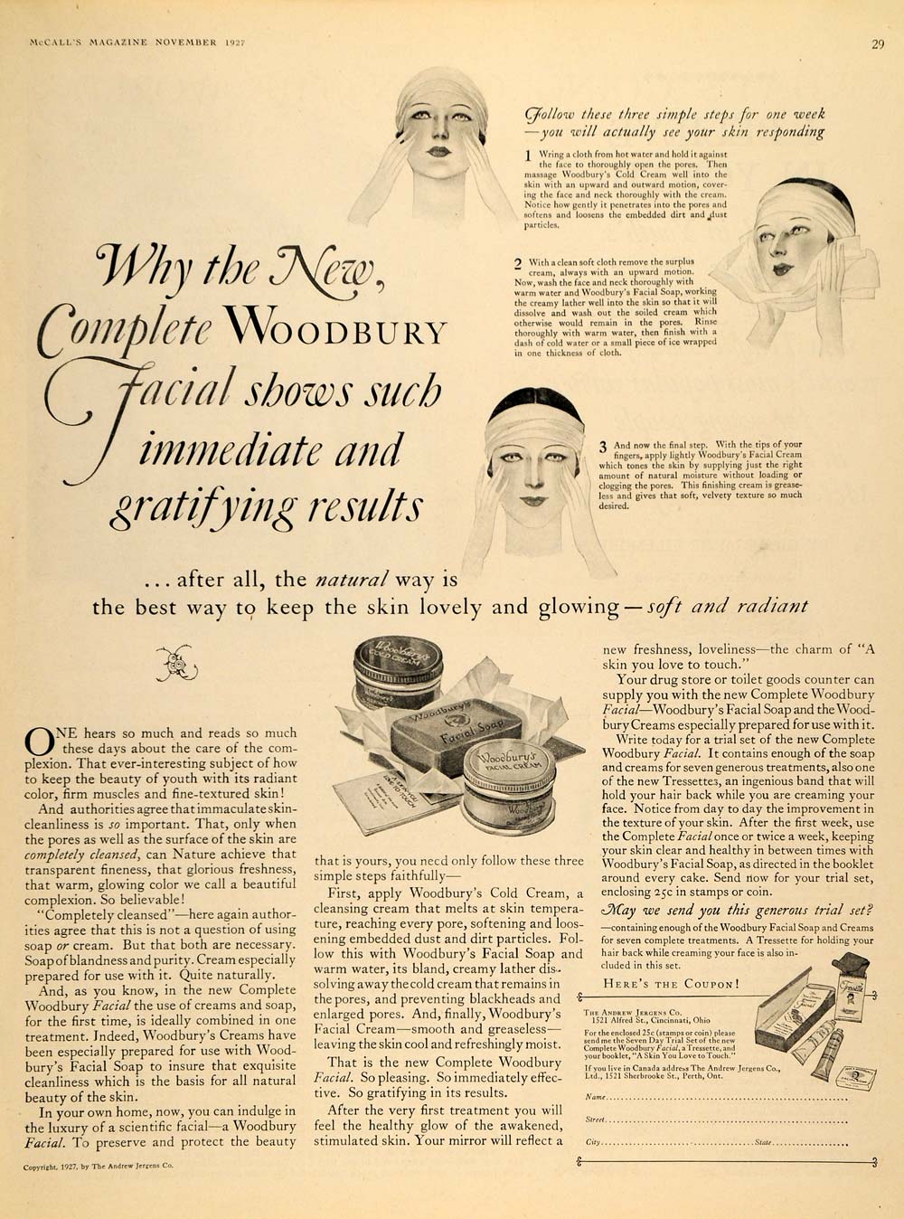This is an original 1927 black and white print ad promoting the Woodbury’s Facial Cream, Soap and Cold Cream from Andrew Jergens Company located at 1521 Alfred Street, Cincinnati, Ohio.