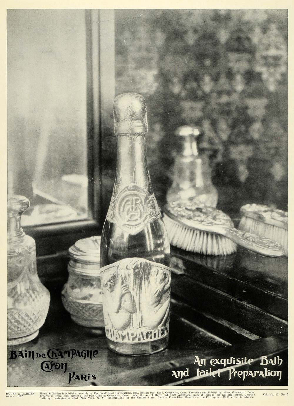 This is an original 1927 black and white print ad for Bain de Champagne by Caron in Paris.