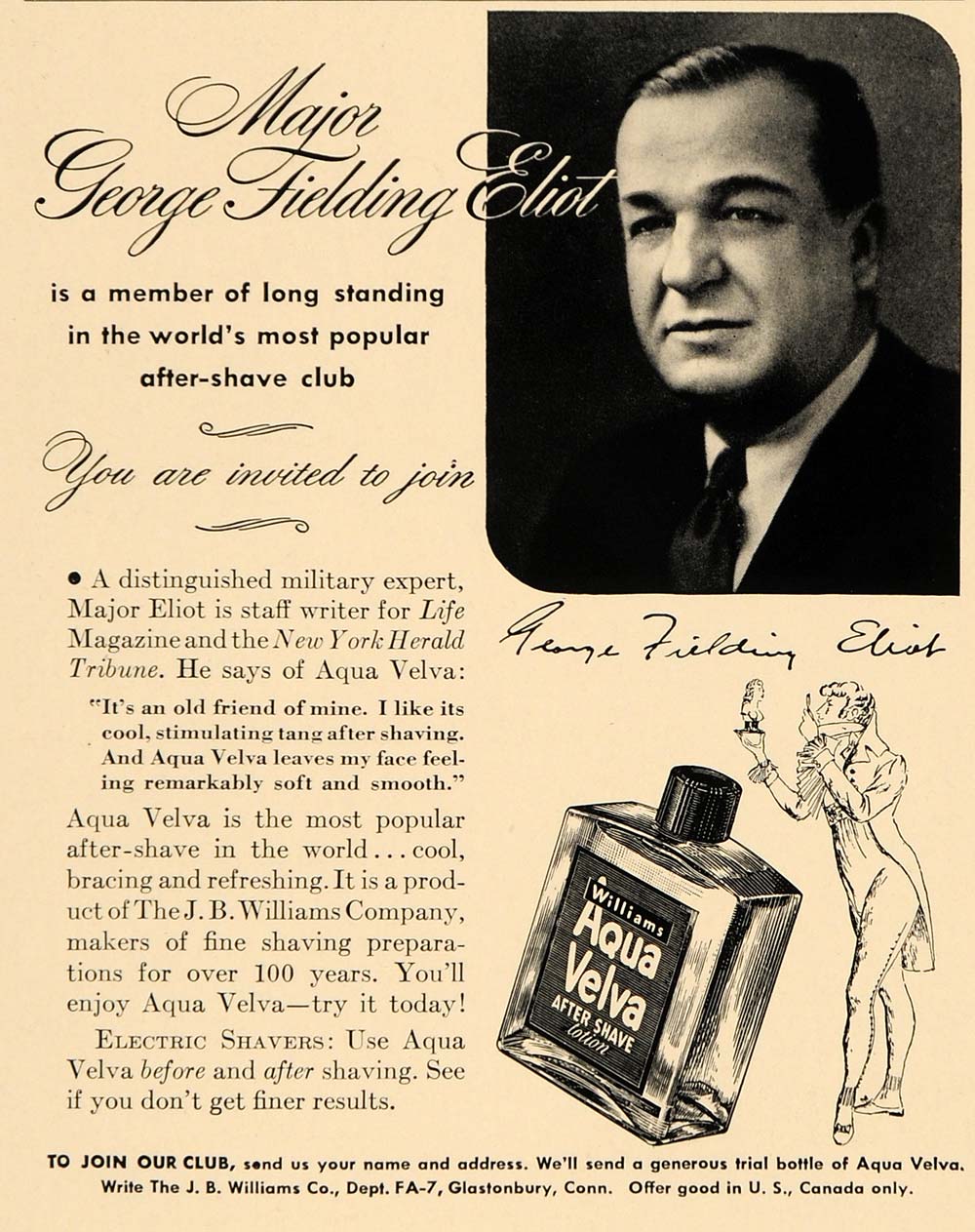 This is an original 1940 black and white print ad for Williams Aqua Velva After Shave Lotion, featuring an image of Major George Fielding Eliot, staff writer for Life Magazine and the New York Herald Tribune.